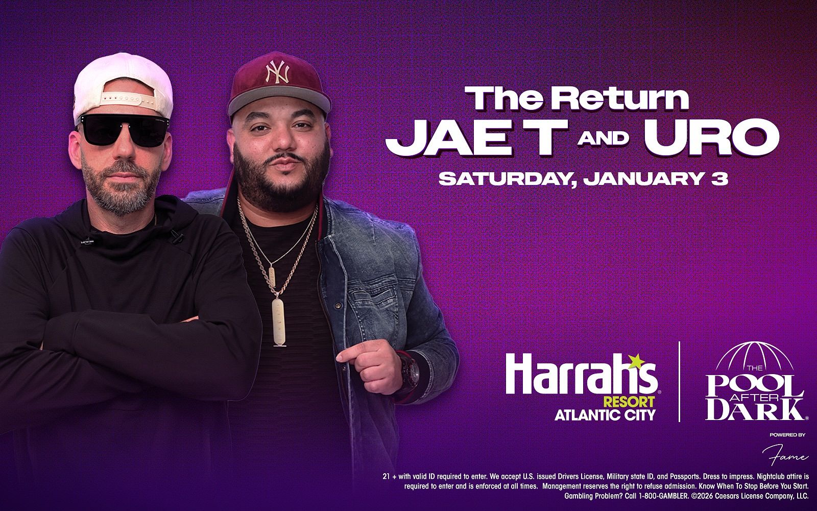 Dive into the ultimate Atlantic City nightlife experience at The Pool After Dark featuring THE RETURN of JAE T AND URO, located inside Harrah's Resort!